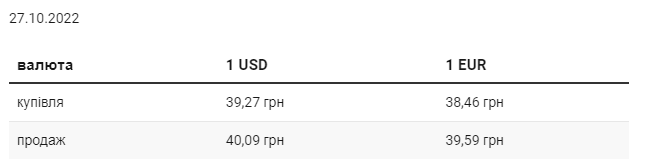 В четверг, 27 октября, средний курс покупки наличного доллара в украинских банках, по сравнению со средой, упал на 15 коп. и составляет 39,27 грн. Курс продаж снизился на 12 коп. и достиг 40,09 грн. Минимальный курс покупки доллара в банках составляет 38,3 грн, максимальный – 39,7 грн. Для продажи минимальный курс – 39,5 грн, максимальный – 40,5 грн. Средний курс покупки евро вырос на 19 коп. и составляет 38,46 грн. Средний курс продаж увеличился на 26 коп. и достиг 39,59 грн. Минимальный курс покупки для евро составляет 37,8 грн, максимальный – 38,96 грн. Для продажи минимальный курс – 39 грн, максимальный – 40,2 грн. | |