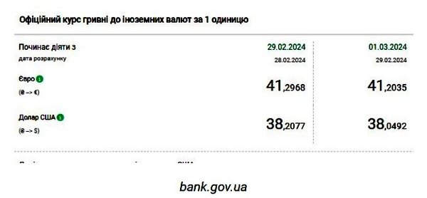 Национальный банк Украины (НБУ) снова снизил курс доллара. Доллар дешевеет третий день подряд. Об этом сообщает РБК-Украина со ссылкой на данные на сайте регулятора. Официальный курс на 1 марта 2024 года установлен на таком уровне: 38,0492 гривен за 1 доллар (-0,1585 грн). Курс евро составит 41,2035 гривен за 1 евро (-0,0933 грн). На межбанке сегодня курс упал на 15 копеек до 38,01-38,03 грн/доллар (покупка-продажа) по сравнению с закрытием в предыдущий день. На наличном рынке курс упал на 5 копеек до 38,65 грн/доллар. | |