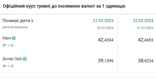 Национальный банк Украины (НБУ) снизил курс доллара к гривне. Доллар подешевел после четырех дней роста и обновления исторических максимумов. Об этом сообщает РБК-Украина со ссылкой на данные на сайте регулятора. Официальный курс на 22 марта 2024 года установлен на таком уровне: 38,9234 гривен за 1 доллар (-0,2165 грн). Курс евро составит 42,4693 гривен за 1 евро (+0,0299 грн). Это новый максимум. Предыдущий был 20 марта - 42,4641 гривен за 1 евро.