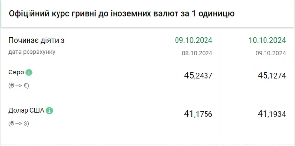 Национальный банк Украины (НБУ) немного поднял официальный курс доллара к гривне. Тем временем курс евро снижается в течение недели. Об этом сообщает РБК-Украина со ссылкой на данные на сайте регулятора. Официальный курс на 10 октября 2024 года установлен на таком уровне: 41,1934 гривен за 1 доллар (+0,0178 грн). Курс евро установлен на отметке 45,1274 гривен за 1 евро (-0,1163 грн).