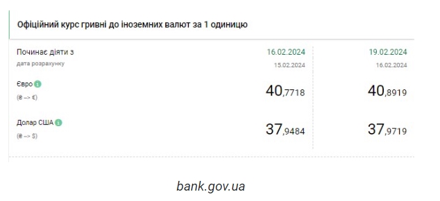 Национальный банк Украины (НБУ) повысил курс доллара. Доллар подрожал после резкого снижения накануне. Об этом сообщает РБК-Украина со ссылкой на данные на сайте регулятора. Официальный курс на 19 февраля 2024 года установлен на таком уровне: 37,9719 гривен за 1 доллар (0,0235 грн). Курс евро составит 40,8919 гривен за 1 евро (+0,1201 грн). На межбанке сегодня курс вырос на 14 копеек до 38,03-38,05 грн/доллар (покупка-продажа) по сравнению с закрытием в предыдущий день. На наличном рынке курс упал на 20 копеек до 38,10 грн/доллар. | |
