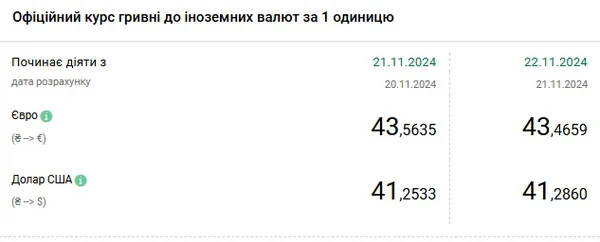 Национальный банк Украины (НБУ) повысил курс доллара к гривне. Доллар подорожал после снижения накануне. Об этом сообщает РБК-Украина со ссылкой на данные на сайте регулятора. Официальный курс на 22 ноября 2024 года установлен на таком уровне: 41,286 гривен за 1 доллар (-0,0777 грн). Официальный курс евро составит 43,4659 гривен за 1 евро (-0,0976 грн).