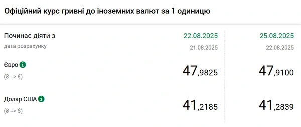 Национальный банк Украины (НБУ) повысил курс доллара к гривне. Доллар подорожал после падения до минимума с начала апреля. Об этом сообщает РБК-Украина со ссылкой на данные на сайте регулятора. Официальный курс на 25 августа 2025 года установлен на таком уровне: 41,2839 гривен за 1 доллар (+0,0654 грн). Официальный курс евро составит 47,91 гривен за 1 евро (-0,0725 грн).
