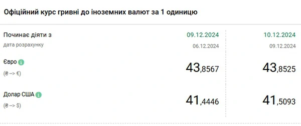 Национальный банк Украины (НБУ) повысил курс доллара к гривне. Доллар дорожает после снижения три дня подряд. Об этом сообщает РБК-Украина со ссылкой на данные на сайте регулятора. Официальный курс на 10 декабря 2024 года установлен на таком уровне: 41,5093 гривен за 1 доллар (+0,0647 грн). Официальный курс евро составит 43,8525 гривен за 1 евро (-0,0042 грн).