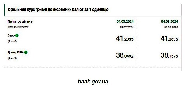 Национальный банк Украины (НБУ) повысил курс доллара. Доллар подорожал после снижения в течение трех дней подряд. Об этом сообщает РБК-Украина со ссылкой на данные на сайте регулятора. Официальный курс на 2 марта 2024 года установлен на таком уровне: 38,1575 гривен за 1 доллар (-0,1083 грн). Курс евро составит 41,2635 гривен за 1 евро (+0,0600 грн). На межбанке сегодня курс вырос на 16 копеек до 38,16-38,19 грн/доллар (покупка-продажа) по сравнению с закрытием в предыдущий день. На наличном рынке курс упал на 5 копеек до 38,50 грн/доллар. | |