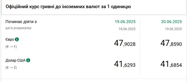 Национальный банк Украины (НБУ) повысил курс доллара к гривне. Доллар дорожает второй день подряд. Об этом сообщает РБК-Украина со ссылкой на данные на сайте регулятора. Официальный курс на 20 июня 2025 года установлен на таком уровне: 41,6854 гривен за 1 доллар (+0,0561 грн). Официальный курс евро составит 47,859 гривен за 1 евро (-0,0438 грн).