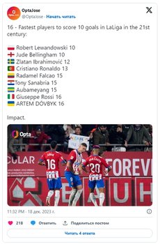 Артем Довбик продолжает демонстрировать отличную результативность на старте сезона 2023/24 в чемпионате Испании. Напомним, что украинский нападающий отметился дублем в 17-м туре испанской Ла Лиги против Алавеса и помог своей Жироне победить соперника 3:0. За такие действия форварда признали лучшим игроком этого поединка. Но это не все. Как сообщает OptaJose, футболист попал в рейтинг игроков, которые быстрее всего забили 10 голов в Ла Лиге в 21-м веке. Рейтинг бомбардиров-дебютантов Ла Лиги XXI века:1-2. Роберт Левандовски, Джуд Беллингем - 10 матчей. 3. Златан Ибрагимович - 12 матчей. 4. Криштиану Роналду - 13 матчей. 5-6-7. Радамель Фалькао, Тони Санабрия, Пьер-Эмерик Обамеянг - 15 матчей. 8-9. Джузеппе Росси, Артем Довбик - 16 матчей. | |