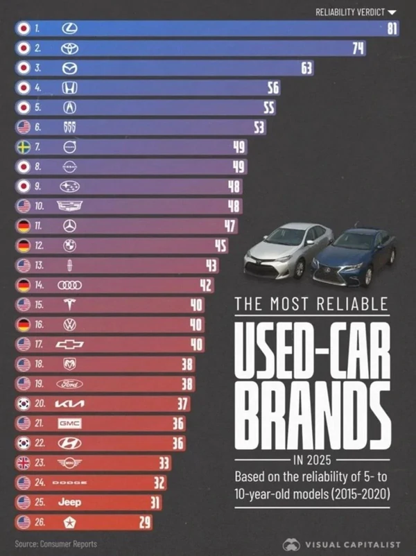 Специалисты назвали бренды, которые выпускают самые надежные автомобили. Всего в рейтинг вошли 26 автопроизводителей из разных стран мира, пишет Visualcapitalist. Отмечается, что специалисты использовали данные Consumer Reports. Эксперты портала попросили читателей рассказать, как часто у них возникали проблемы с их транспортными средствами за последние 12 месяцев. В анализе принимали участие подержанные автомобили 2015-2020 модельных годов. По итогам исследования оказалось, что наиболее надежными являются японские машины. Первые места заняли Toyota и Lexus, тогда как на третьей позиции оказалась Mazda. На четвертой и пятой позициях рейтинга расположились Honda и Acura. Среди неяпонских брендов в первую десятку попали только Buick, Volvo и Cadillac. Mercedes-Benz оказался на 11-й позиции, а BMW - на 12-й. Отметим также, что Toyota стала наиболее популярным автомобильным брендом в 2024 году. В целом ей удалось продать более 9 миллионов автомобилей. На второй позиции оказался немецкий Volkswagen, тогда как третье место занял китайский BYD. | |