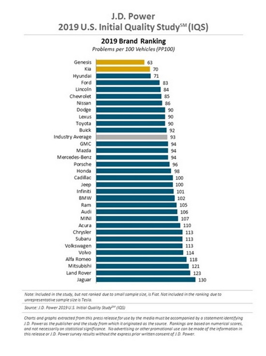 Американские специалисты из компании J.D. Power and Associates опубликовали ежегодный рейтинг качества новых автомобилей Initial Quality Study. Возглавили его три корейских бренда - Genesis, Kia и Hyundai. Об этом отмечается на сайте компании.Премиальный бренд Genesis получил наименьшее количество жалоб на 100 проданных автомобилей (63 из 100). Идущая за ним Kia несколько уступает по показателям (73/100), а Hyundai идет почти наравне с ней (71/100). При этом Land Rover оказался самым эффективным в области улучшений своих автомобилей. Качественно улучшил свои результаты также Jaguar. Далее идут компании Ford (83/100), Lincoln (84/100), Chevrolet (85/100), Nissan (86/100), Dodge (90/100), Lexus (90/100) и Toyota (90/100). Полный перечень автомобильных брендов, включенных в рейтинг: ![]() | |