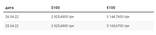 Согласно официальному курсу Национального банка Украины, 26 апреля курс гривны по отношению к евро вырос на 21 копейку. По отношению к доллару курс национальной валюты остается на том же уровне. | |