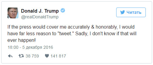 Известное издание Financial Times сообщает, что по их версии человеком 2016 года стал избранный президент США Дональд Трамп. Об этом сегодня сообщает "Новое время"."Он переписал правила политики США. Теперь президент, являющийся специалистом по заключению сделок, сможет показать, как будет исполнять предвыборные обещания", - пишет издание в статье о Трампе. Победу политика на выборах президента США журналисты сравнивают с тем, как в Италии у власти находился бизнесмен и любитель футбола Сильвио Берлускони. Журналисты также отмечают сложные отношения Трампа со СМИ и его любовь к провокационным публикациям в собственном Twitter. "Если бы журналисты говорили обо мне с уважением и точностью, то я бы меньше писал в Twitter. К сожалению, я не знаю случится ли это когда-либо", - заявлял Трамп. ![]() | |