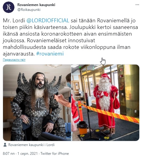 ![]() Фото: twitter.com/Roikaupunki Кроме Йоулупукки, который в силу возраста прививался одним из первых, вторую дозу вакцины получил лидер рок-группы Lordi – победителя Евровидения-2006