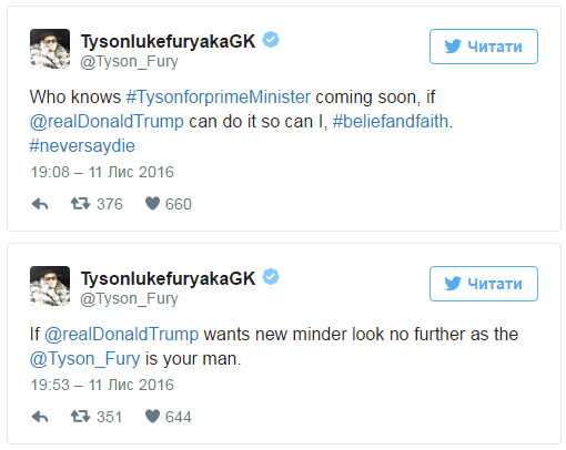 Очевидно, лишенному боксерской лицензии Тайсону скучно сидеть дома без дела, потому он решил предложить свои услуги новоизбранному президенту США Дональду Трампу, а заодно и немного попиариться на популярной нынче теме.В своем Twitter Тайсон написал: «Кто знает, возможно вскоре я стану новым премьер-министром. Если Трамп смог, то и я могу надеяться и верить». «Если Дональд ищет нового помощника, тогда я готов. Я именно тот, кто ему нужен». ![]() После победы над Кличко Фьюри потерял всяческую мотивацию и начал употреблять кокаин, за что и был лишен боксерской лицензии и всех титулов чемпиона мира по версиям IBF, WBO и WBA. | |
