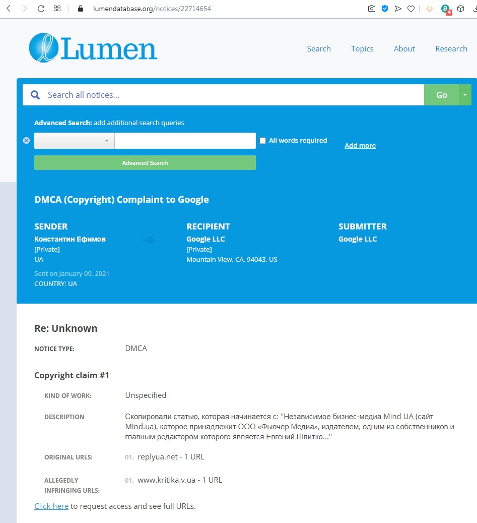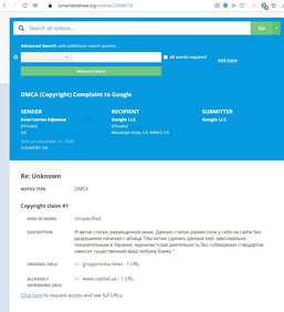 Последние несколько дней в центре внимания мировых СМИ и общественности были «баны» аккаунтов пока еще действующего президента США Дональда Трампа в соцсетях, прежде всего в Twitter и Facebook , а также «бану» приложений и сайтов, которыми пользовались преимущественно его сторонники.Как оказалось, в Украине некоторые также используют «баны» для улучшения своей репутации и борьбы с конкурентами. За последние две недели в Google было отправлено десятки фейковых жалоб с Законом США «Об авторском праве в цифровую эпоху» (DMCA) на удаления и блокировку веб-страниц известных украинских финансовых сайтов: Дело, Минфина, Финанса, Капитала, Экономические новости, Комментарии и других. Жалобы были поданы от имени Константина Ефимова якобы владельца сайта gruppirovka.news на другие финансовые и новостные украинские сайты. Также ряд жалоб был подан якобы от имени других сайтов. Все жалобы идентичные и касаются нескольких новостей о том, что на сайт mind.ua и его главреда и собственника Евгения Шпитко подали несколько исков в суд за статью Любови Величко на сайте mind.ua, который порочит деловую репутацию ряда компаний и финансовых учреждений и физических лиц. По нашей информации, некоторые редакции СМИ уже в курсе о такой мошеннической схеме и попытке удалить этот контент из поисковика, поэтому отправили встречные уведомления в Google. Поисковая система не предпримет никаких действий. Как отмечают SEO-специалисты, такие массовые удовлетворенные жалобы способны привести к понижению поисковых позиций сайта, на который жалуются, и «вылету» его из поисковой системы Google. То есть таким образом можно расправиться с конкурентами — финансовыми сайтами. Как сообщалось, ранее по такой же схеме (с использованием домена в зоне .news) пытался неудачно удалить негативную информацию о себе бывший руководитель «Спецтехноэкспорта» Павел Барбул, который сейчас находится под следствием за растрату 55,5 млн гривен средств госпредприятия и вывод их за границу в пользу иностранного юридического лица. Также жалобы были поданы на десятки зарубежных сайтов, на которых вышел материал про Павла Барбула, Дениса Гурака, Владимира Усова, их бизнес и проект A.D.A.M. под названием «Criminal cases have been initiated against the founder and ex-head of the A.D.A.M project in Ukraine». В материале зарубежные журналисты сообщали о том, что основатели, руководители и инвесторы проекта по печати человеческих костей и органов A.D.A.M, который был запущен в Украине в 2019 году, сейчас находятся под следствием в Украине по делу о разворовывании средств государственного бюджета в особо крупных размерах. Речь шла об уже бывшем главе Госкосмоса Украины Владимире Усове и Павле Барбуле. На сайте ukrlenta.news, от имени которого подавались жалобы, кроме материалов о Павле Барбуле, также были размещены перепечатки статей с сайта Mind.ua, например, об Укргазбанке. Как писали СМИ, именно Павла Барбула считали реальным мажоритарным собственником сайта Mind.ua до недавнего времени. В настоящий момент Евгений Шпитко сконцентрировал 90% ООО «Фьючер Медиа», которому принадлежит сайт mind.ua. Напомним, в начале ноября 2020 года сайт mind.ua, его редакцию и главного редактора Евгения Шпитко, уличили в обмане партнеров и рекламодателей путем накрутки ботами официального Telegram-канала mind_live , страницы на Facebook, Viber-чата, а также статистики сайта. Через несколько дней сервис аналитики Tgstat удалил и
