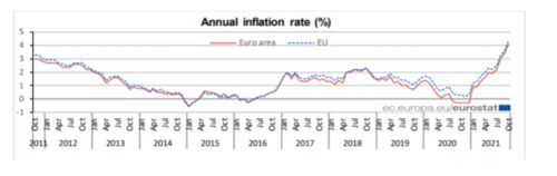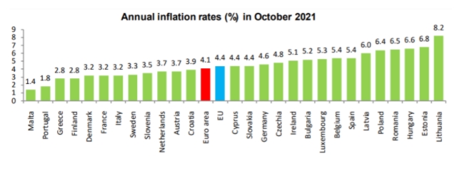 Уровень годовой инфляции в еврозоне достиг 4,1% в октябре по сравнению с 3,4% в сентябре, а в ЕС – 4,4% против 3,6%.Согласно данным статистического бюро ЕС Евростата, причиной повышения уровня инфляции послужил рост цен на энергоносители (+2,21%) и услуги (+0,86%). Также отмечается повышение стоимости промышленных товаров (0,55%), продуктов питания, алкоголя и табака (0,43%). В октябре самая большая инфляция зафиксирована у Литвы (8,2%), Эстонии (6,8%), Венгрии (6,6%), Румынии (6,5%), Польши (6,4%) и Латвии (6%). В то же время другие страны зафиксировали умеренный рост инфляции. Согласно прогнозам Еврокомиссии инфляция в еврозоне на 2021 год должна была составить 1,1%, для ЕС – 1,3%. | |