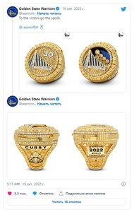 Награда нашла героев. Голден Стэйт получил чемпионские перстни за победу в чемпионате 2021/22. Случилось это торжественное событие перед стартовым матчем этого сезона, в котором "воины" играли с Лейкерс. Перед тем, как команды вышли на паркет для выяснения сильнейшего, прошло чествование Уорриорз, которые стали чемпионами лиги по итогам сезона-2021/22. Традиционно игрокам и тренерскому штабу Голден Стэйт были презентованы чемпионские перстни. | |