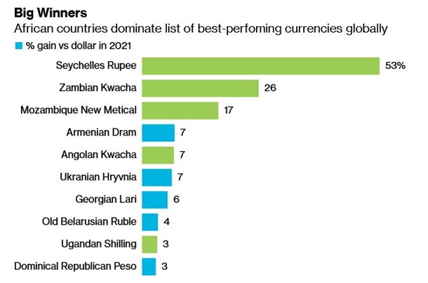 Агентство Bloomberg составило рейтинг мировых валют, больше всего укрепившихся к доллару в этом году. В топ-10 вошла украинская гривна.На первом месте с большим отрывом расположилась сейшельская рупия, которая благодаря восстановлению туризма укрепилась на 60%. На втором месте замбийская квача, на третьем мозамбикский метикал. Далее идут армянский драм, ангольская квача и украинская гривна. В десятку также вошли грузинский лари, белорусский рубль, угандийский шиллинг и доминиканский песо. | |