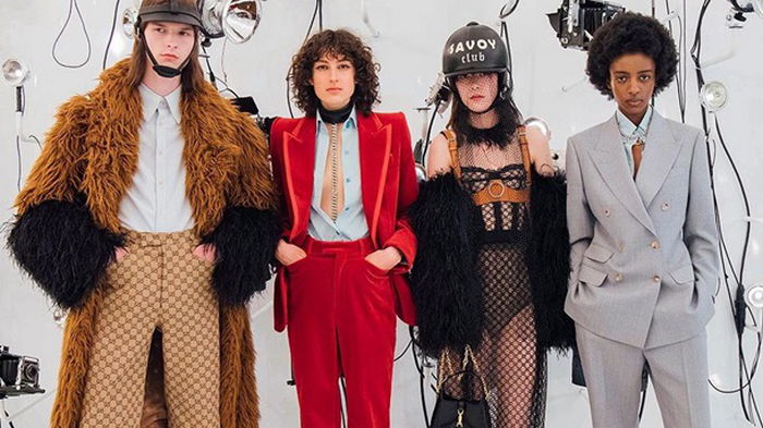 Модные дома Gucci и Balenciaga презентовали совместную коллекцию одежды под названием Aria, которую выпустили к сотому юбилею Gucci.Создателями колекции Воздух выступили креативный директор Gucci Алессандро Микеле и его коллега из Balenciaga Демна Гвасалия. Знаменуя юбилей, коллекция наполнена символизмом и историческими отсылками Gucci. Коллекция Микеле также известна своими ремнями. В Aria есть белые кейпы, короткие свитера, пальто цвета фуксии, рубашки. Наряды моделей, дополнены аксессуарами Balenciaga, были с логотипами обоих модных домов. В начале видео мужчина дефилирует в красном бархатном костюме, намекая на наряд Гвинет Пелтроу 1996 года, в котором она предстала на церемонии MTV Video Music Awards. В свое время его создал Том Форд, поэтому костюм - символ уважения к истокам бренда. | |