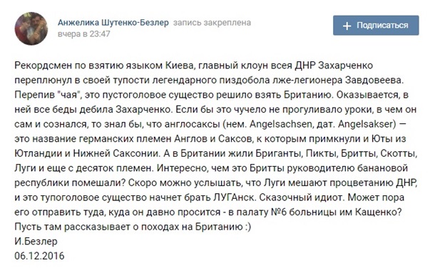 Между самопровозглашенными ДНР и ЛНР может разгореться настоящая война. Такой прогноз озвучил один из лидеров сепаратистов Донбасса Игорь Безлер. Соответствующее заявление сегодня было опубликовано в сети ВКонтакте."Скоро можно услышать, что Луги мешают процветанию ДНР", – говорится в заявлении Безлера, опубликованном в соцсети ВКонтакте. Он также добавил, что после этого глава ДНР Александр Захарченко "начнет брать Луганск". Кроме того, Безлер удостоил Захарченко таких эпитетов, как "сказочный идиот" и "рекордсмен по взятию языком Киева". "Может пора его отправить туда, куда он давно просится – в палату №6 больницы им Кащенко? Пусть там рассказывает о походах на Британию", – предложил Безлер. ![]() | |