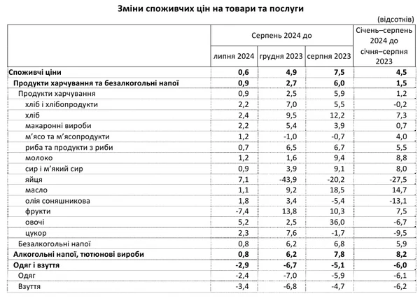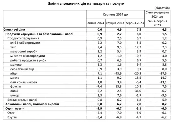 Потребительские цены в Украине в августе 2024 года выросли на 0,6%. Годовая инфляция ускорилась до 7,5%. Об этом сообщает РБК-Украина со ссылкой на Государственную службу статистики (Госстат). По данным статистического ведомства, выше годовая инфляция была только в августе прошлого года (8,6%.) Цены на товары и услугиПо данным Госстата, продукты питания и безалкогольные напитки за август подорожали на 0,9%. Больше всего подорожали яйца - на 7,1% и овощи - на 5,2%. Цены на алкогольные напитки и табачные изделия выросли на 0,8%, на одежду и обувь - упали на 2,9%. Жилье, вода, электроэнергия, газ и другие виды топлива подорожали на 0,2%. Цены на предметы домашнего обихода и бытовую техника выросли на 0,1%, здравоохранение подорожало на 1,0%, транспорт - на 0,6%, цены на связь выросли на 0,7%, на отдых и культуру выросли на 0,1%, образование подорожало на 0,3%, рестораны и гостиницы подорожали на 1,5%, разные товары и услуги на 0,6%. Прогноз ценНапомним, в июле НБУ ухудшил прогноз по инфляции в 2024 году до 8,5% с 8,2%. НБУ ожидает, что общая инфляция в Украине ускорится в течение следующих трех кварталов, но будет оставаться умеренной. | |