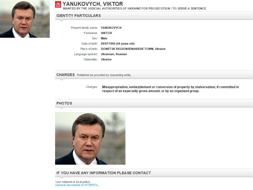 Интерпол объявил в розыск экс-президента Украины Виктора Януковича, экс-премьер-министра Николая Азарова и ряд других экс-чиновников.