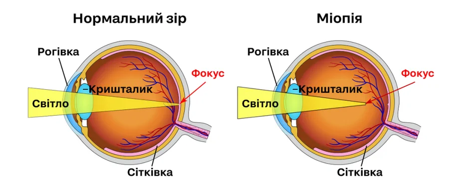 Короткозорість (міопія) є рефракційною вадою ока, при якій людина має знижену здатність бачити чітко на відстані. Це стан, який виникає через неправильне фокусування світла в оці, при якому зображення фокусується перед сітківкою, а не на ній, що призводить до розмитого зображення далеких об'єктів. Короткозорість може бути вродженою або розвиватися протягом життя, її можна коригувати за допомогою окулярів, контактних лінз або хірургічних втручань. Діагностувати та вилікувати міопію допоможе офтальмолог. Чому розвивається міопія у дитини?Міопія у дітей може розвиватися з кількох причин, включаючи генетичні фактори, середовище та стиль життя. Генетика грає важливу роль у схильності до короткозорості, оскільки діти, у яких є близькі родичі з міопією, мають підвищений ризик захворювань очей.