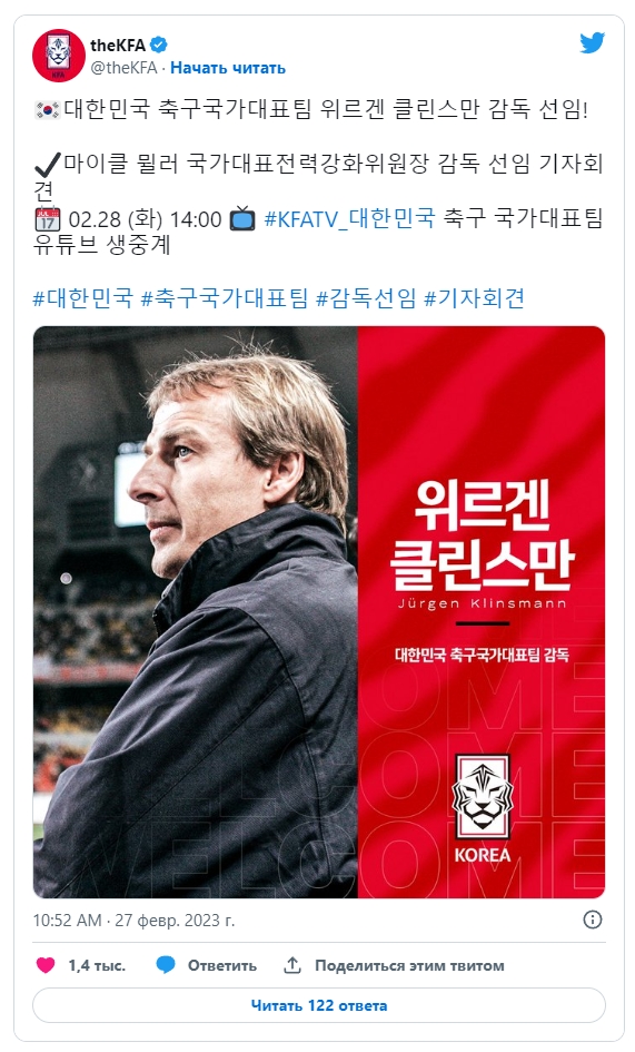 Юрген Клинсманн возвращается к тренерской работе. Легендарный в прошлом нападающий сборной Германии возглавил национальную команду Южной Кореи. Об этом официально сообщила Корейская футбольная ассоциация. Детали сделки не разглашаются. Напомним, что ранее главным тренером команды был Паулу Бенту. С ним Корея дошла до 1/8 финала ЧМ-2022, однако там была разгромлена бразильцами, после чего португальский специалист подал в отставку. Что касается Юргена Клинсманна, то 58-летний специалист ранее тренировал сборные Германии и США, а также немецкие Баварию и Герту. С Бундестим он стал бронзовым призером ЧМ-2006, а с американской – выиграл Золотой кубок КОНКАКАФ. | |
