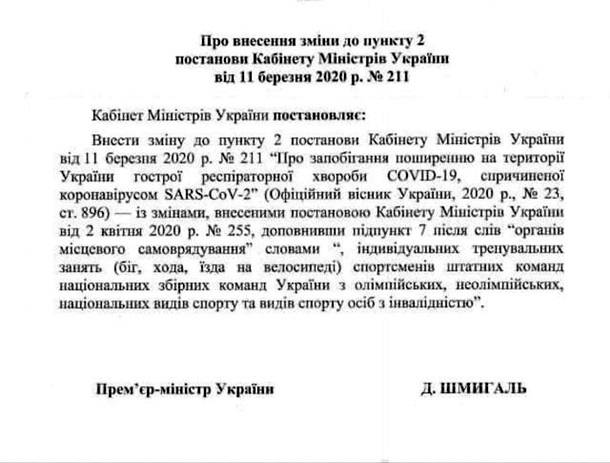 Кабинет министров на сегодняшнем заседании единогласно проголосовал за изменения в постановление "О предотвращении распространению на территории Украины коронавируса COVID-19", которыми позволили членам национальных сборных Украины вернуться к тренировкам в индивидуальном режиме.Решение правительства касается бега, езды на велосипеде и тренировок паралимпийцев-колясочников, а также безопасных индивидуальных тренировок в спортзалах. ![]() | |