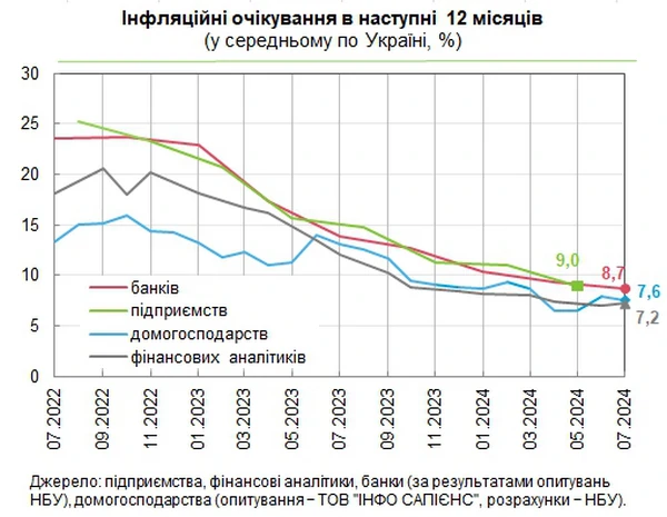 Инфляция в Украине в течение следующих 12 месяцев ускорится, однако не превысит 9%. Такой прогноз дают банкиры, финансовые аналитики, руководители предприятий и населения. Об этом сообщает РБК-Украина со ссылкой на данные на сайте НБУ. По информации НБУ, в июле финансовые аналитики ожидают инфляцию на уровне 7,2%. Это выше, чем предыдущий прогноз за июнь (7,1%). Население прогнозирует рост цен на 7,6%. В июне граждане ждали инфляцию на уровне несколько выше - 7,9%. Банкиры прогнозируют инфляцию на уровне 8,7%. Руководители предприятий роста цен на уровне 9,0% (данные за май). Прогнозы по инфляцииПо данным Госстата, в июле инфляция в годовом исчислении ускорилась до 5,4% с 4,8% в июне. В месячном измерении цены не изменились. В июле НБУ ухудшил прогноз по инфляции в 2024 году до 8,5% с 8,2%. НБУ ожидает, что общая инфляция в Украине ускорится в течение следующих трех кварталов, но будет оставаться умеренной. Кроме того, НБУ прогнозирует инфляцию в 2025 году на уровне 6,6% (предыдущий прогноз – 6,0%), в 2026 году инфляция упадет до 5,0% (предыдущий прогноз – 5,0%). | |