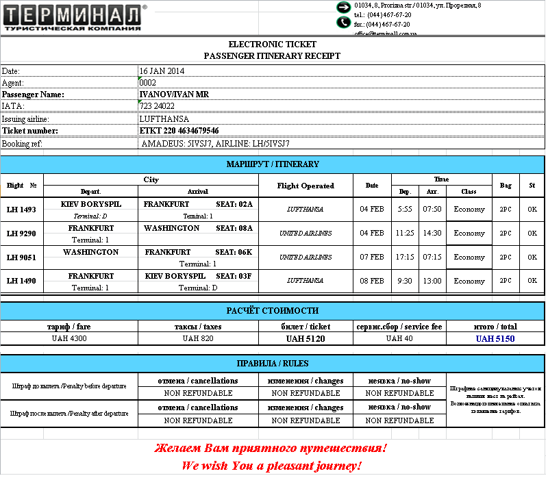 Электронные виды авиабилетов – это фактически те же самые авиабилеты, но в менее привычном виде для туристов. Многие из клиентов воспринимают обычный билет, как бланк конкретной авиакомпании. Но вся информация, которая содержится в обычном авиабилете, присутствует и в электронном варианте.В современное время сфера для продаж и распространения авиабилетов более широкая: онлайн авиакассы, турагентства и специализирующиеся на их продаже порталы. Поэтому, популярность такого вида продаж набирает стремительные обороты, и полезным будет узнать важные рекомендации использования электронных авиабилетов, которые приводит туристическая компания «Тернимал» на своем сайте FlyUA.com.ua. Как правильно использовать электронные авиабилеты?Такой современный вид авиабилетов абсолютно ничем не уступает привычному, бумажному виду билета. Перелеты на самолете с наличием электронного билета не вызовет абсолютно никаких затруднений для клиента.Конечно же, для полной идентификации клиента потребуется наличие документа, который удостоверяет вашу личность, собственно как и для бумажного билета, данные из которого вы использовали для покупки электронного вида авиабилета. Это может быть гражданский паспорт - для рейсов внутри страны, и заграничный паспорт – для международных перелетов. Документ придется предъявить только во время самой регистрации, это единственно требование к туристу, который использует e-ticket. В исключительных случаях, и только некоторые авиакомпании, при регистрации могут попросить предъявить также и банковскую карточку, с помощью которой вы покупали этот e-ticket. Но это только в исключительных случаях и только с целью обеспечения безопасности сделок, и только тогда, когда вы действительно оплатили заказа электронного билета карточкой в сети. В случае, если вы покупали авиабилет в глобальной сети с помощью другой платежной системы, наличие банковской карты не обязательно. Еще один совет для клиентов, использующих e-ticket, сохраняйте маршрут-квитанцию на протяжении перелета. В некоторых аэропортах эта квитанция может потребоваться для прохождения паспортного контроля. Он может стать доказательством наличия билета у туриста на обратный авиаперелет, который требуют при посещении определенных зарубежных стран. И последнее, одно из главных преимуществ электронного авиабилета – в случае его повреждения либо утери, его всегда можно повторно распечатать. Просто не удаляйте полученное электронное письмо от авиакомпании с e-ticket. В результате, у вас всегда будет резервная копия электронного билета на перелет. | |