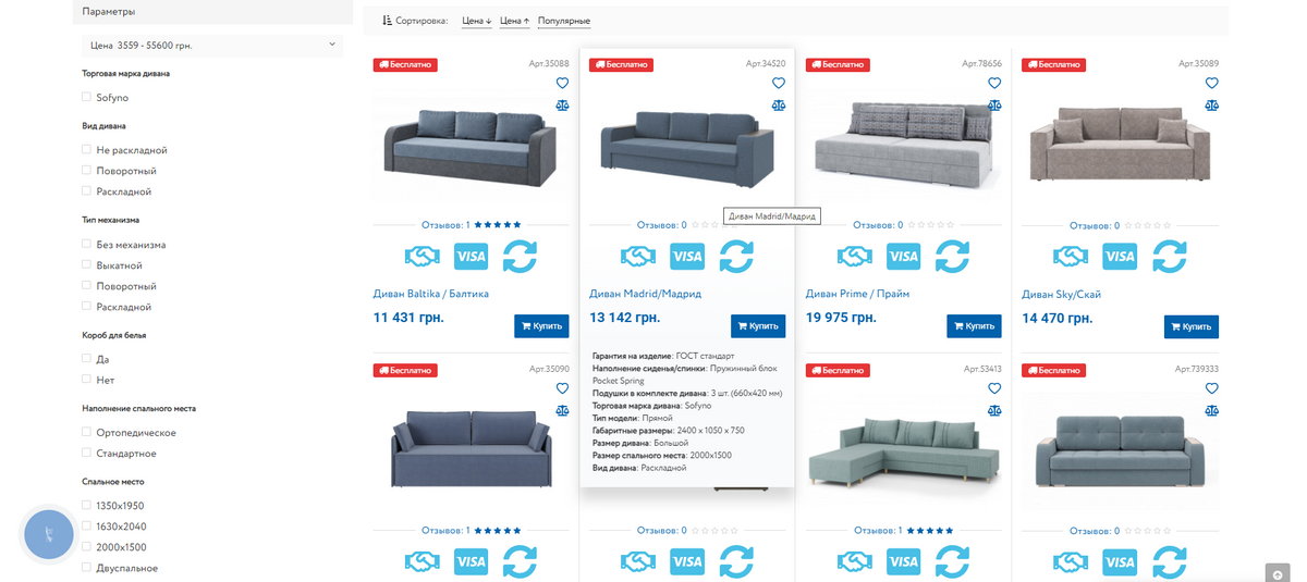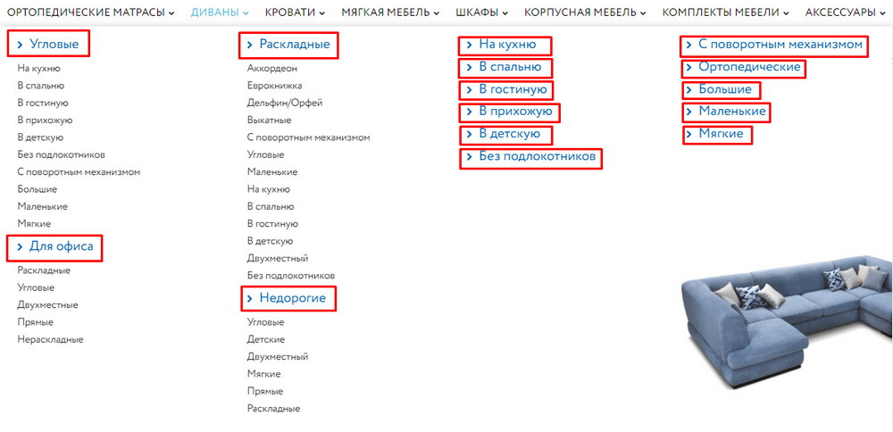 Логичная структура, подробный каталогЗадача специалиста — разработать такую структуру и каталог сайта, чтобы посетители могли максимально быстро найти мебель по назначению, типу и другим ключевым характеристикам. Мы используем специальные сервисы, чтобы сформировать категории интернет-магазина, соответствующие наиболее популярным запросам. Один из возможных фильтров — сортировка диванов по разным критериям: