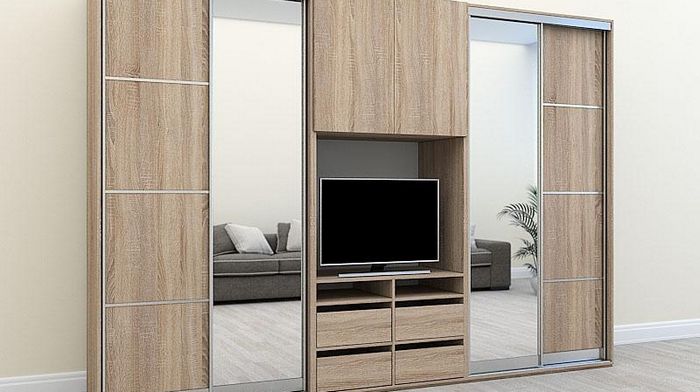 - шкаф-купе для гостиной должен быть ещё более функциональным – здесь хранят одежду, книги, семейные фотографии, цветы и многое другое. Важно выбрать модель с зоной для телевизора – здесь техника располагается удобно и не занимает лишнего места;