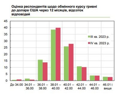 Доля респондентов, ожидающих, что в следующие 12 месяцев обменный курс национальной валюты не превысит 40,00 грн/доллар, составила 55,4% (в ІІІ квартале 2023 года - 56,5%).