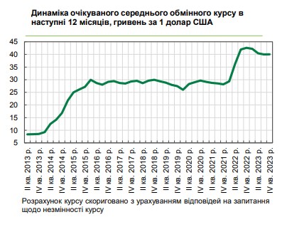 Квартальный опрос проводился с 31 октября по 28 ноября 2023 года. В опросе приняло участие 659 предприятий из 21 региона страны. Результаты опросов отражают только мнение респондентов - руководителей предприятий, а не оценки Национального банка Украины. Прогнозы курсаКабинет министров в бюджете на 2024 год заложил средний курс на уровне 40,7 грн/доллар, к концу 2024 года курс ожидается на уровне 42,1 грн/доллар. Финансовые аналитики прогнозируют, что курс доллара в течение следующих 12 месяцев составит около 40 гривен. Как заявил глава НБУ Андрей Пышный, курс доллара к гривне в течение 2024 года будет колебаться в соответствии с рыночными условиями и сезонностью. В то же время, НБУ обеспечит курсовую устойчивость и привлекательность гривны. | |