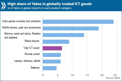 По данным исследования организации экономического сотрудничества и развития (OECD) по торговле контрафактными и поддельными устройствами, каждый пятый реализованный в мире смартфон является подделкой, пишет издание 4pda.OECD отмечает, что среди фальшивой продукции часто встречаются зарядные устройства, карты памяти и адаптеры, ноутбуки, планшеты, пульты управления и многое другое. Основным источником поддельной техники считается Китай. По данным экспертов, наибольшие финансовые потери от изготовителей фальшивок понесли Соединённые Штаты Америки. В отчёте также отмечается, что контрафактные товары представляют угрозу не только для безопасности личных данных, но и здоровью пользователей. Ко всему прочему, реализация поддельной техники не лучшим образом сказывается на доходах компаний и репутации брендов. Согласно опубликованным данным, за 2013 год на поддельные устройства пришлось около 6,5% от всей мировой торговли. Эта цифра превысила показатель поддельной техники, зафиксированный в 2016 году, - 2,5%. Статистика такова: около 43% изъятой поддельной продукции нарушили права интеллектуальной собственности американских производителей. За ними расположились финские фирмы - порядка 25%, а третье место досталось японским изготовителям - 12%. ![]() | |