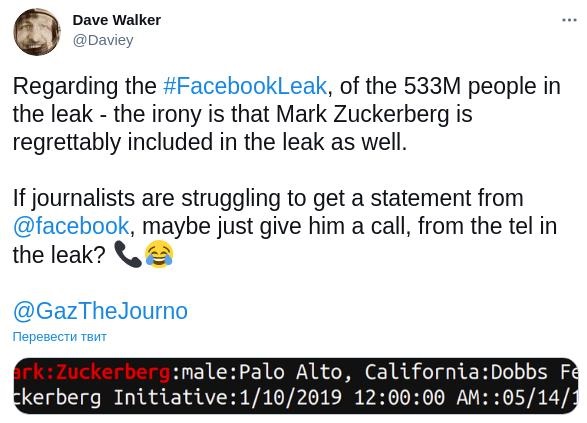 Данные основателя социальной сети Facebook Марка Цукерберга оказались слитыми вместе с информацией о более полумиллиарда пользователей соцсети из 106 стран, пишет газета New York Post 4 апреля.На хакерском форуме появились имена, локации, даты рождения, телефонные номера и другие сведения 533 миллионов человек. "Ирония в том, что данные Марка Цукерберга, к сожалению, тоже слили в сеть. Раз у журналистов не получается добиться заявления от Facebook, может, им стоит позвонить ему на оказавшийся в общем доступе номер?", - написал пользователь Twitter Дейв Уокер, изучивший форум. | |