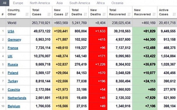 Накануне в мире выявили более 663 тысячи новых случаев коронавируса - лидирует США, где зафиксировали более 120 тысяч новых инфицирований. Об этом свидетельствуют данные Worldometers в четверг, 2 декабря.На втором месте в рейтинге оказалась Германия - около 72 тысяч новых случаев, а на третьем Франция - более 49 тысяч новых инфицирований. Пятерку по приросту заболеваемости замыкают Британия и Россия. В то же время больше всего смертей за день от коронавируса зафиксировали в США (1 633), России (1 226), Польше (570). С начала пандемии от коронавируса выздоровели 238 050 544 человека. В настоящее время насчитывается более 20 миллионов активных случаев заболевания. При этом скончались уже 5 242 124 человек. | |