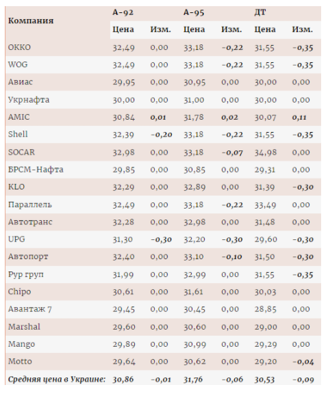 16 ноября крупные розничные сети АЗС откорректировали цены на бензин и дизельное топливо. Об этом свидетельствуют данные ежедневного ценового мониторинга Консалтинговой группы А-95.В частности, на WOG и ОККО бензин марки А-95 подешевел на 0,22 грн, до 33,18 грн/л, дизельное топливо — на 0,35 грн, до 31,55 грн/л. В сети UPG цены на бензины и ДТ также уменьшились: А-92 — до 31,30 грн/л, А-95 — до 32,20 грн/л и ДТ — до 29,60 грн/л. KLO снизила стоимость только дизтоплива – до 31,39 грн/л. Изменение розничных цен на бензины и дизельное топливо на АЗС с 15 по 16 ноября, грн/л | |