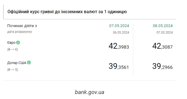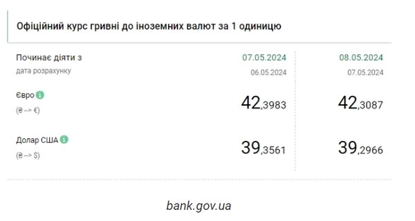 Национальный банк Украины (НБУ) снизил курс доллара к гривне. Доллар дешевеет четвертый день подряд. Об этом сообщает РБК-Украина со ссылкой на данные на сайте регулятора. Официальный курс на 8 мая 2024 года установлен на таком уровне: 39,2966 гривен за 1 доллар (-0,0595 грн). Курс евро составит 42,3087 гривен за 1 евро (-0,0896 грн). На межбанке сегодня курс не изменился - 39,28-39,30 грн/доллар (покупка-продажа) по сравнению с закрытием в предыдущий день. На наличном рынке курс упал на 5 копеек до 39,80 грн/доллар. | |