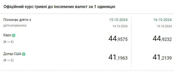 Национальный банк Украины (НБУ) повысил курс доллара к гривне. Доллар дорожает второй день подряд. Об этом сообщает РБК-Украина со ссылкой на данные на сайте регулятора. Официальный курс на 16 октября 2024 года установлен на таком уровне: 41,2139 гривен за 1 доллар (+0,0176 грн). Курс евро составит 44,9232 гривен за 1 евро (-0,0343 грн).