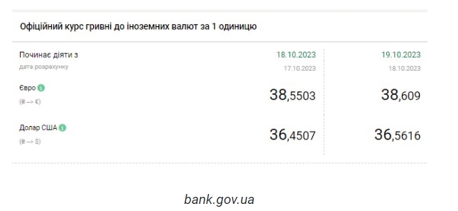 Национальный банк Украины (НБУ) снова повысил официальный курс доллара. Курс вернулся на уровень, который был до перехода в режим управляемой гибкости. Об этом сообщает РБК-Украина со ссылкой на данные на сайте регулятора. Официальный курс гривны к доллару на 19 октября 2023 года установлен на таком уровне: 36,5616 гривен за 1 доллар (+0,1109 грн). Курс евро составит 38,609 гривен за 1 евро (+0,0587 грн). | |