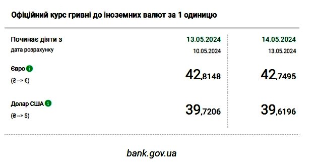 Национальный банк Украины (НБУ) снизил курс доллара к гривне. Доллар подешевел после роста три дня подряд. Об этом сообщает РБК-Украина со ссылкой на данные на сайте регулятора. Официальный курс на 14 мая 2024 года установлен на таком уровне: 39,6196 гривен за 1 доллар (-0,1010 грн). Курс евро составит 42,7495 гривен за 1 евро (-0,0653 грн). На межбанке сегодня курс вырос на 9 копеек до 39,66-39,72 грн/доллар (покупка-продажа) по сравнению с закрытием в предыдущий день. На наличном рынке курс не изменился -39,95 грн/доллар. | |