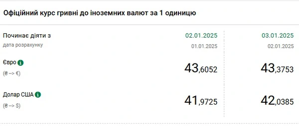 Национальный банк Украины (НБУ) повысил курс доллара к гривне. Доллар подорожал после снижения в течение двух дней. Об этом сообщает РБК-Украина со ссылкой на данные на сайте регулятора. Официальный курс на 3 января 2025 года установлен на таком уровне: 42,0385 гривен за 1 доллар (+0,0660 грн). Официальный курс евро составит 43,3753 гривен за 1 евро (-0,2299 грн).