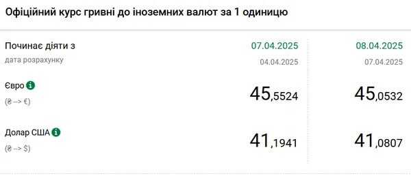 Национальный банк Украины (НБУ) снизил курс доллара к гривне. Доллар подешевел до минимума с начала сентября 2024 года. Об этом сообщает РБК-Украина со ссылкой на данные на сайте регулятора. Официальный курс на 8 апреля 2025 года установлен на таком уровне: 41,0807 гривен за 1 доллар (-0,1134 грн). Ниже курс был только 3 сентября прошлого года - 41,0592 грн/доллар. Официальный курс евро составит 45,0532 гривен за 1 евро (-0,4992 грн).