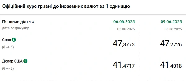 Национальный банк Украины (НБУ) снизил курс доллара к гривне. Доллар дешевеет третий день подряд. Об этом сообщает РБК-Украина со ссылкой на данные на сайте регулятора. Официальный курс на 9 июня 2025 года установлен на таком уровне: 41,4018 гривен за 1 доллар (-0,0699 грн). Курс опустился до минимума с 22 апреля (41,3785 грн/доллар). Официальный курс евро составит 47,2726 гривен за 1 евро (-0,1047 грн).