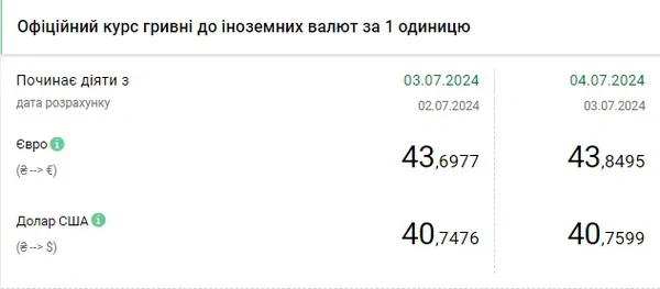 Национальный банк Украины (НБУ) повысил курс доллара к гривне до нового исторического максимума. Об этом сообщает РБК-Украина со ссылкой на данные на сайте регулятора. Официальный курс на 4 июля 2024 года установлен на таком уровне: 40,7599 гривен за 1 доллар (+0,1063 грн). Предыдущий максимум был зафиксирован только 3 июля - 40,7476. Курс евро составит 43,8495 гривен за 1 евро (+0,1518 грн).