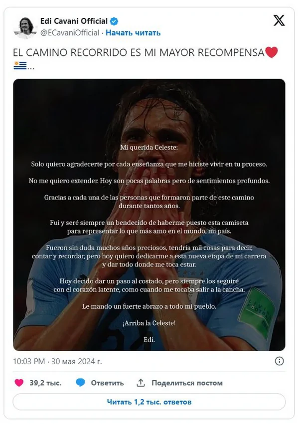 Эдинсон Кавани решил прекратить выступления за сборную Уругвая. 37-летний футболист объявил, что завершит свою карьеру в составе двукратных чемпионов мира сразу после Копа Америка-2024. Я решил отойти в сторону, но мое сердце все еще бьется, как тогда, когда настал мой черед выйти на поле в этой красивой майке. Крепко обнимаю всех своих фанатов", – написал Кавани. Отметим, что Эдинсон Кавани дебютировал за сборную Уругвая в феврале 2008 года. В 136 матчах за "небесно-голубых" 37-летний форвард записал на свой счет 58 голов и 17 результативных передач. Вместе с Уругваем он выиграл Копа Америка в 2011 году. Напомним, что Копа Америка в 2024 году пройдет с 20 июня по 14 июля. Уругвай выступит в одной группе из США, Панамой и Боливией. | |