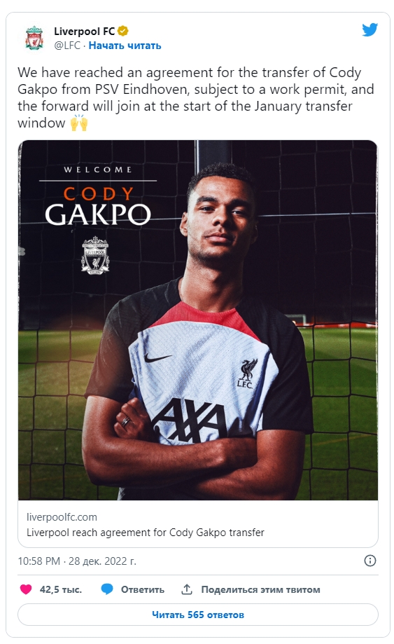 Коди Гакпо подписал контракт с Ливерпулем. Об этом официально объявила пресс-служба английского клуба. 28 декабря нидерландец прошел медосмотр на базе мерсисайдцев и подписал соглашение с командой Клоппа. В новом клубе он будет выступать под 18 номером. Условия сделки не разглашаются, но по данным СМИ, соглашение рассчитано на 5 с половиной лет. В Ливерпуле зарплата форварда составит 120 тысяч фунтов в неделю. Сумма трансфера - 42 млн евро + 13 млн евро бонусами. | |