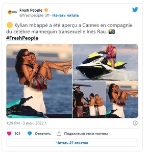 Килиан Мбаппе закрутил роман с трансгендерной моделью Инес Рау. В этом уверенны европейские СМИ. Так издание Corriere dello Sport, утверждает, что 23-летний нападающий ПСЖ и сборной Франции и 32-летняя модель встречаются уже несколько месяцев. Впервые их заметили вместе на Каннском кинофестивале в мае. Позже футболиста в компании модели видели на борту яхты во время совместного отдыха. При этом Мбаппе и Рау пока никак не прокомментировали слухи о своих отношениях. Инес Рау родилась в 1990 году в Париже в семье алжирцев. Стала известна как первая трансгендерная модель, попавшая на обложку журнала Playboy в 2017 году. В 16 лет она перенесла операцию по смене пола, но публично объявила об этом только в возрасте 24 лет. В 2018 году Рау выпустила автобиографическую книгу под названием "Женщина". | |