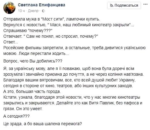 Мэр Днепра Борис Филатов уволил свою заместительницу Светлану Епифанцеву по соглашению сторон после провокационных высказываний в социальной сети чиновницы о государственном языке. Об этом 28 февраля официально сообщила пресс-служба горсовета.Филатов поблагодарил заместителя за помощь в создании коалиции в горсовете. Однако, по его словам, такому решению способствовали еще и "склоки и бесконечное выяснение отношений с другими работниками исполкома. Последней каплей стала необоснованная критика государственной языковой политики". Он отметил, что чиновник безусловно имеет право на личное мнение, но "публичное рассуждения чиновника о статусе государственного языка как минимум ссорит между собой жителей территориальной общины, а как максимум - нарушает хрупкую стабильность в стране". Епифанцева, которая возглавляет местную организацию Оппоблок, в своем скандальном посте на Facebook пожаловалась, что из-за украинского дубляжа фильмов люди якобы прекратили ходить в кинотеатры, в результате чего те закрываются. ![]() "Если кто-то до сих пор считает, что я и дальше буду терпеть ваше безделье, хамство, пьянство и глупости в соцсетях, то он серьезно ошибается. Никакие политические договоренности, заслуги прошлого или личные симпатии не станут для вас индульгенцией от увольнения", - ранее писал Филатов и призвал ее к увольнению. | |